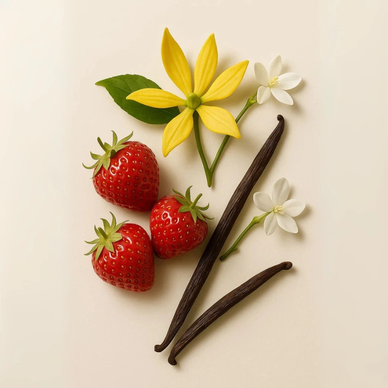V úvodu dominuje šťavnatý černý rybíz, hruška a jahoda, které probouzejí pocit svěžesti a radosti. Srdce tvoří jemná květinová směs jasmínu, ylang-ylangu a tuberózy. Základ je teplý a smyslný díky vanilce z Madagaskaru, pačuli a ambře, které zanechávají dlouhotrvající stopu.